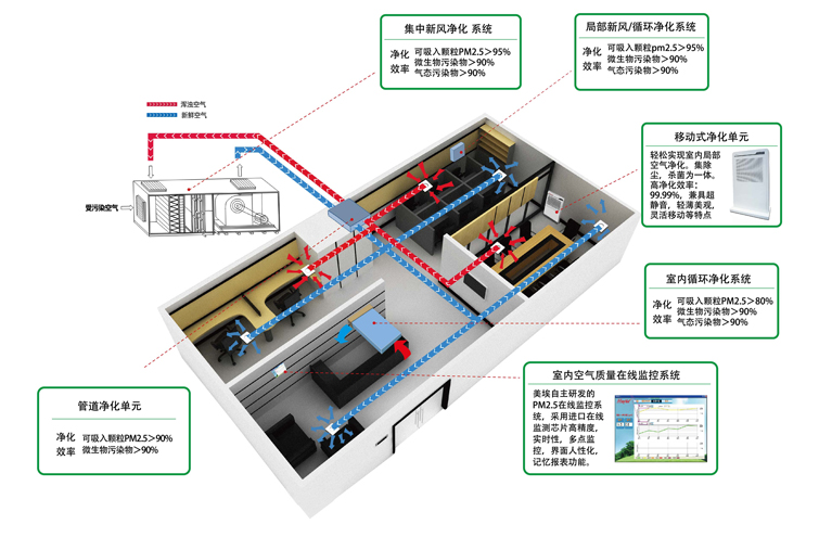 在商場、超市、酒店、機場等人群擁擠的公共場所中,人流量大,各種不同的固體、液體微粒、細菌等,空氣中會產生很多污染。天皓室內空氣解決方案主要針對商用及民用建筑,涵蓋顆粒物、微生物污染物、氣態污染物的控制,通過初效過濾器+中效過濾器等組合,有效吸附建筑物內室內空氣中的甲醛、乙醛、酮類、有機化學物等污染雜質。